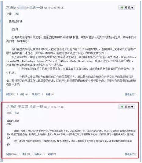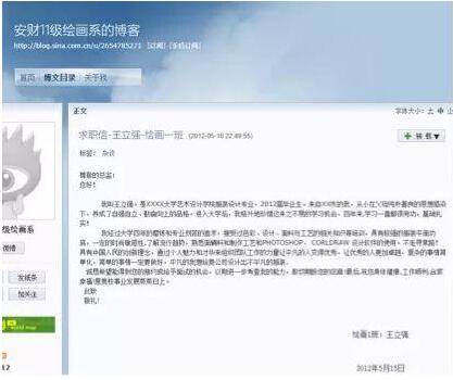 当时,这个“安财11级绘画系”的博客刊登了多名学生的“求职信”,但由于2011级的学生在2012年时还不可能毕业,而且这些“求职信”看起来很像是从某些求职信“模板”中抄过来的,里面的个人信息还大多是用“XX”表示的,所以这更像是某种“学写求职信”的作业。