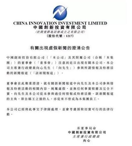 向心还通过中国创新投资有限公司表示,他已经将此事交给律师,将考虑对此事采取法律行动。