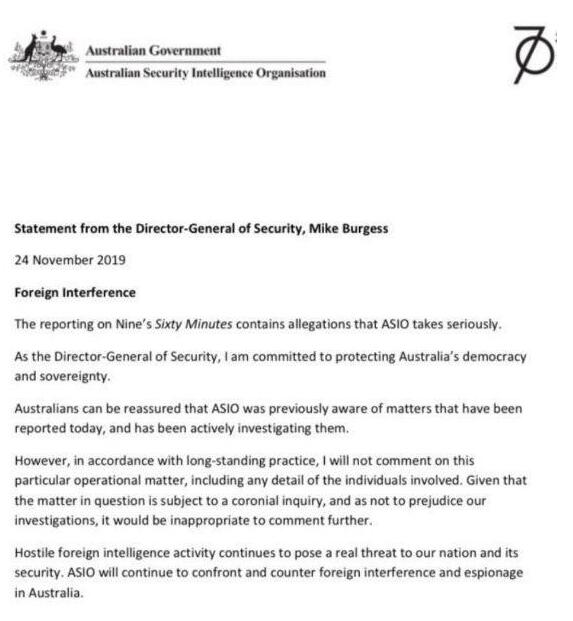 图为澳大利亚安全情报组织发布的声明