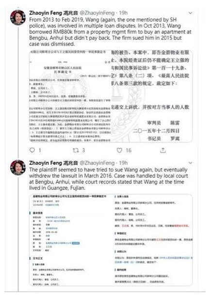 比如英国BBC驻美国华盛顿的记者冯兆音,就在她的社交账号上罗列出了王立强之前在内地的那些庭审记录和大学记录。这些信息也开始令一些外国网民怀疑起王立强的身份来。