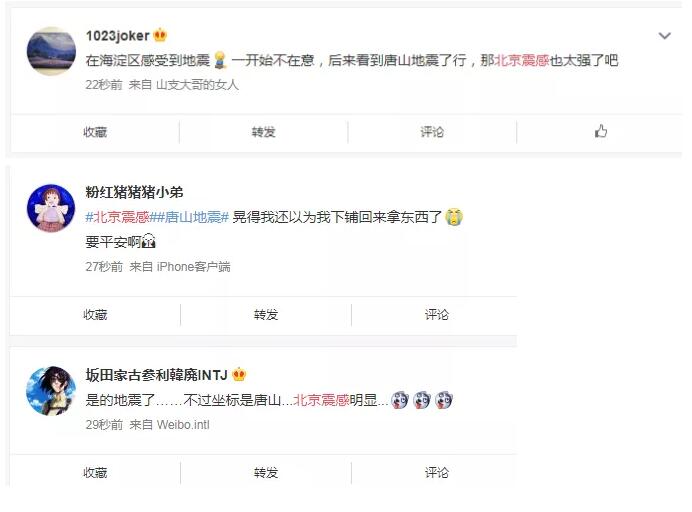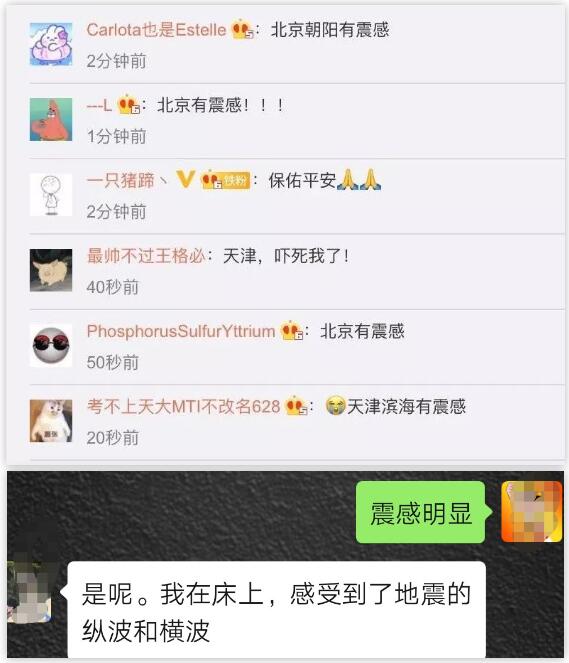据新京报报道,北京、天津多地居民有震感,晃动持续数秒。北京市海淀、通州、大兴等多地居民表示,地震发生时有震感,“前后两次,每次持续有三四秒。”不少人称,当时刚醒躺在床上,感到了床明显摆动。