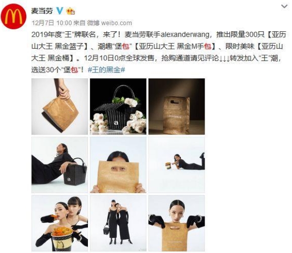 这次跨界不简单。北京时间7日,麦当劳在官方微博晒出了自己的年度“王”牌联名,分别为售价99元的黑金M手包,以及限量300只的黑金篮子,售价5888元。好在麦当劳还没忘记自己是个快餐品牌,在给包包打广告的基础上也不忘推出限时的99元“黑金桶”。