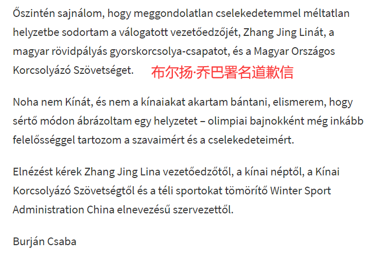 在官网首页的轮播新闻中,刊登了布尔扬·乔巴的这封道歉信,信中写道:“令我感到遗憾的是,我让我的团队负责人张晶,匈牙利短道速滑队和匈牙利国家滑冰协会蒙受屈辱。尽管我不想伤害中国和中国人,但我承认我的做法令人反感——作为奥林匹克冠军,我需要对自己的言行举止更加负责。我向总教练张晶,中国滑冰联合会和中国冬季运动管理局致歉。”署名是布尔扬·乔巴本人。