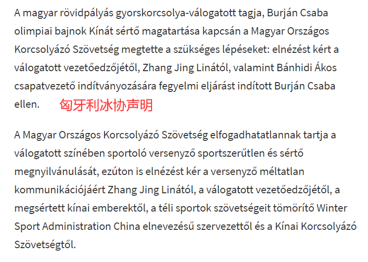 北京时间12月11日,来自匈牙利冰协官网的消息,此前在中国上海制造辱华事件的匈牙利短道速滑队员布尔扬·乔巴本人,在冰协官网上发表了公开的道歉声明,为自己“令人反感”的行为道歉。此外,匈牙利冰协也再次发布公告,表示采取了必要措施向张晶道歉,发起对布尔扬·乔巴的纪律处罚,并再次向受伤的中国人民道歉。