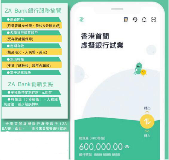【香港商報網訊】金管局發出首批虛擬銀行牌照至今近9個月,市場終於迎來首間虛擬銀行。由眾安在線(6060)牽頭成立的眾安銀行(ZABank)昨日宣布即日起試業,透過金管局的金融科技監管沙盒,向約2000名特選客戶提供服務。據了解,該行現有服務包括遙距開戶、存款、轉帳等,其中定期存款入場門檻僅為1元,港元一年期定存息達2厘。香港商報記者 張智榮