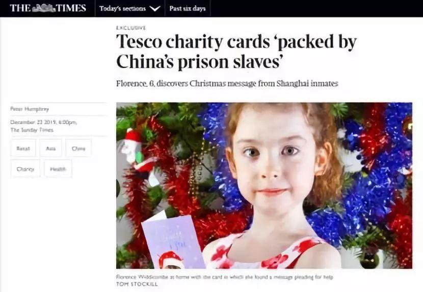 【香港商報網訊】12月22日,英国《星期日泰晤士报》爆料一则“大新闻”,称英国伦敦一名6岁女孩从英国TESCO乐购超市买到的一张圣诞贺卡,是上海青浦监狱关押的外籍囚犯生产的,因为贺卡里竟然被人写上了求救的内容。