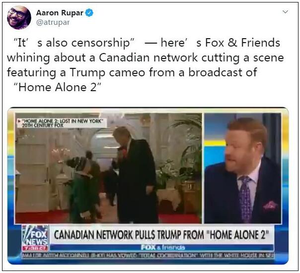 特朗普的大儿子也在推特上说,“可悲:特朗普在《小鬼当家2》中的客串镜头消失后,加拿大广播公司遭到炮轰。”