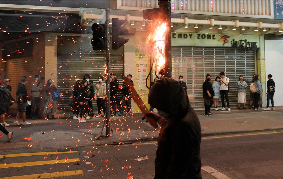 社會動蕩嚴重打擊正在放緩的香港經濟。圖為上周六黑衣人於上水聚集騷擾商戶,致使商場商戶拉閘,旅客紛紛離開。中通社