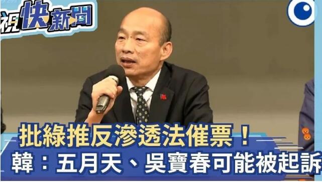 辩论会结束后,韩国瑜接受媒体访问时说:“反渗透法”一旦通过,包括五月天、卖面包的吴宝春都可能被起诉。