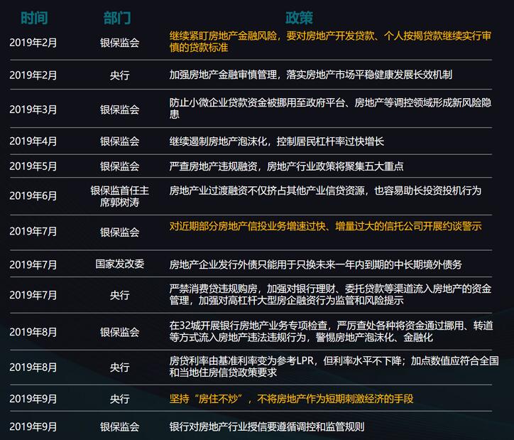2019年在市场流动性整体放松的环境下,房地产金融侧却愈加收紧,向市场传递出明显信号。即“房住不炒”已从行业源头入手,不但要控制房地产开发企业风险,同时通过金融侧调控,有力提升房地产去产能化的节奏,2019年房地产金融侧的调控来看,主要采取了三步走。