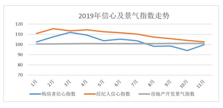 从安居客购房者信心指数来看,全年的波动向下的特点非常明显,“小阳春”之后就一路波动下行,直至11月稍有回调,购房者对于房地产未来的预期普遍走平,随之投机性购房需求同步撤离。值得关注的是,年末一线城市的购房者心态回调的幅度较为明显,二线城市则出现轮动性下滑,购房者心态分化在明年或将体现得更为明显。从经纪人信心指数来看,全年呈现更为平滑的下行倾向,经纪人的心态波动性要小于购房者,但整体对后市普遍看平的态度更为普遍化。