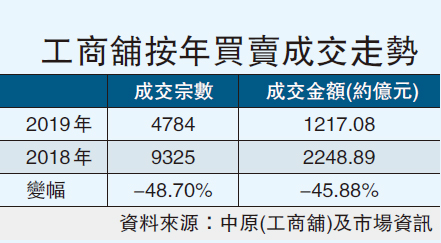 據中原(工商舖)數據顯示,去年全年總共錄得約4784宗工商舖買賣個案,累積總金額約1217.08億元。翻查資料,2003年沙士疫情時成交宗數約6215宗,而2008年金融海嘯時期亦錄得約10947宗成交,意味2019年工商舖市場投資氣氛較前述兩個低潮時期更為淡靜。