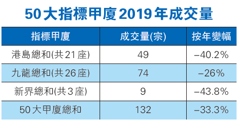 此外,去年錄得的50大甲廈買賣之中,上半年佔逾三分之二。下半年受到修例風波影響,甲廈成交量急跌,合共只有42宗,佔全年成交不足三分之一,當中8月份至12月份更是連續5個月錄得單位數買賣。