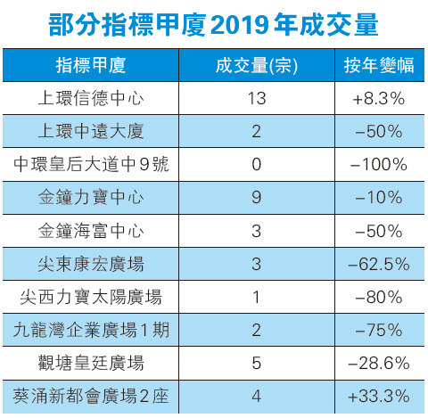 跌市之下中環其他甲廈交投冰封,當中皇后大道中九號及環球大廈,全年均未錄得任何成交。事實上,去年有17座指標甲廈錄零成交,數目較2018年的11座有所上升。
