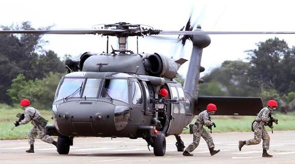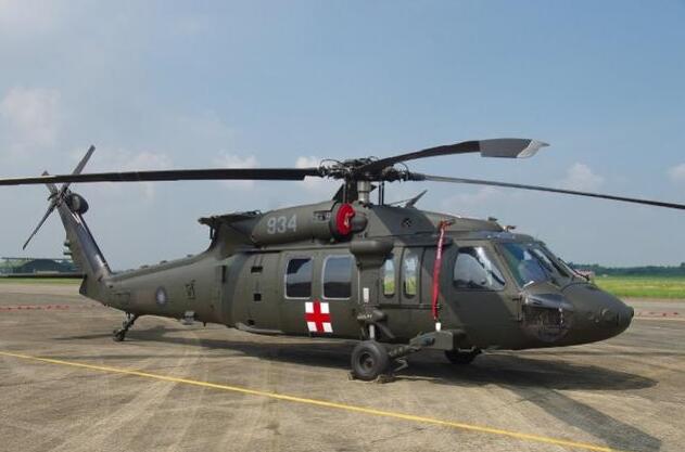 黑鹰直升机是美国西科斯基公司生产的双涡轮轴引擎、单旋翼直升机,是从S-70型发展而来的一种中型通用或攻击直升机。主要特色是在高海拔与海上救灾、救难、救护、观测、侦巡、运输等任务,可装载15名人员(含飞行员2员、机工长2员、搜救员2员)或救护担架4具。