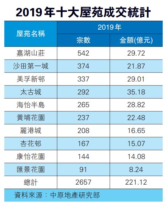 【香港商報网訊】記者呂希蘊報道:中原地產統計2019年本港十大藍籌屋苑二手買賣合約登記共錄得2657宗,創2016年後的3年新高;整體十大屋苑金額錄得上揚,總值221.12億元,創2012年以來7年新高。成交最活躍的三大屋苑分別是嘉湖山莊、沙田第一城及美孚新邨。