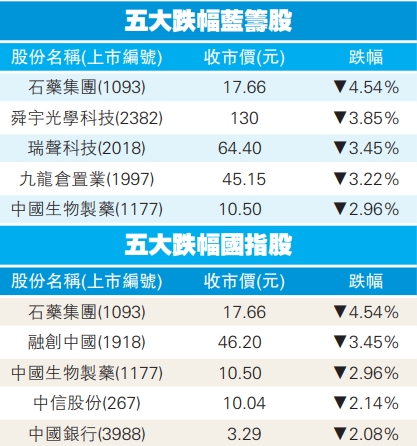 至於重磅股方面走勢就較弱,騰訊(700)則跌1.46%,報377.4元;阿里巴巴(9988)收報211元,微跌0.47%。有傳百度已就赴港第二上市進行內部評估,港交所(388)逆市升0.38%,報267.6元。