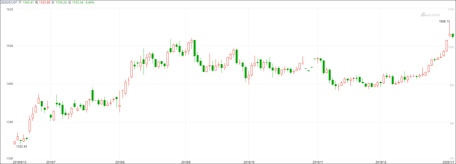 【香港商报网讯】近日,美伊冲突、中东紧张局势升级,市场避险情绪加速升温,国际油价、金价持续走高。纽约商品交易所(COMEX)2月黄金期货6日收于1568.80美元/盎司,刷新近7年新高。中信建投研报预测,本轮金价有望突破1700美元。