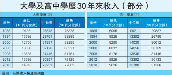 至於過去10年(2008-2018年)高中學歷收入,最低的一成由8176元升至9626元(升約17.7%),最高一成由31446元跌至31308元(跌約0.4%),但他們薪酬中位數收入過去10年持續上升,由13836元升至15700元(升幅約13.5%),2018年的高中學歷薪酬較30年前升幅58.3%。(見附表)