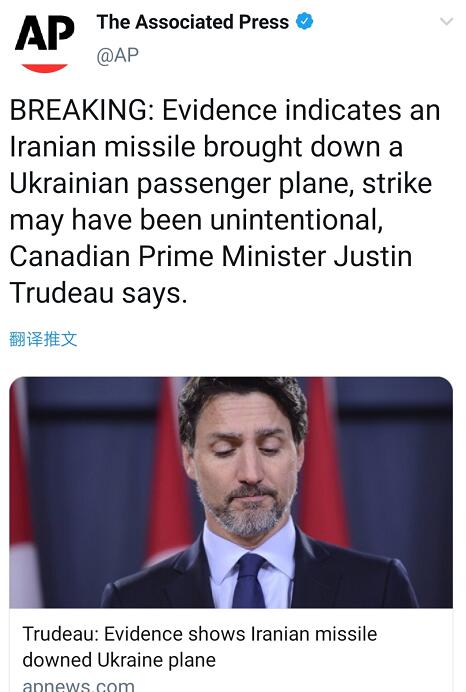 特鲁多当天对记者说:“从(来自)盟友及我们自己的等多个消息来源获得情报,有证据表明这架飞机是被伊朗的地对空导弹击落的。”