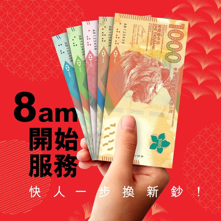由1月14日至21日,滙豐提供農曆新年前兌換新鈔的特別安排,旗下所有分行將提早1小時,於早上8時開始服務。滙豐13家分行將實施客流管理措施,長者取籌後可於指定座位區等候,毋須於櫃枱前排隊。