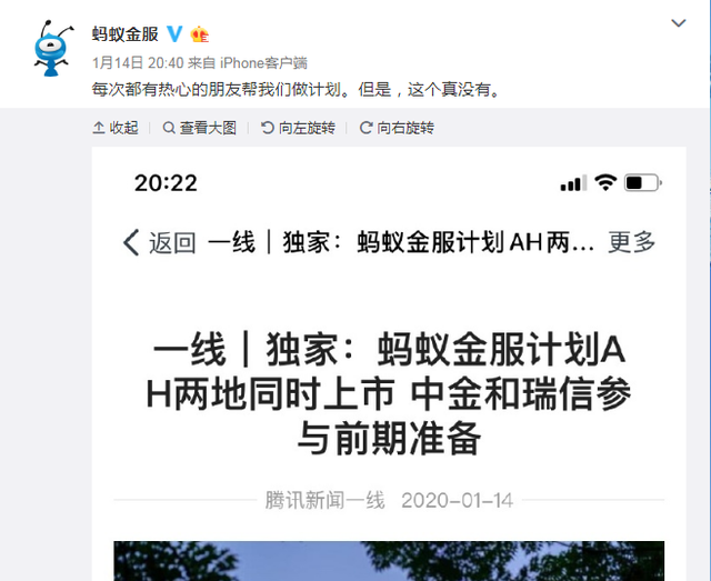 对此,蚂蚁金服于昨日晚间在其官方微博对此消息进行了否认,回应称:每次都有热心的朋友帮我们做计划。但是,这个真没有。
