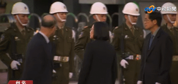 有眼尖的台湾网民发现,当蔡英文转身进入“国防部”时,她面前的“宪兵”却出现转向失误。听到长官“向后转”口令时,有人往左、有人往右,宛如转圈圈。