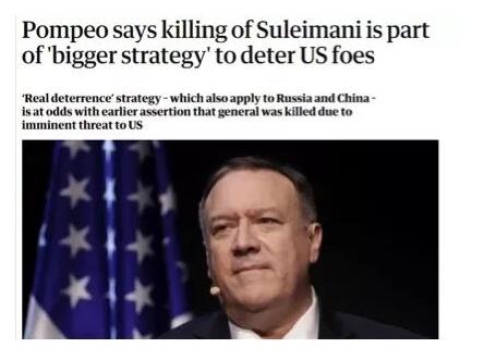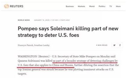 如上图所示,路透社在其昨日的一篇报道中宣称,美国国务卿蓬佩奥在周一就暗杀伊朗军队高官苏莱曼尼一事发表讲话时说,杀死苏莱曼尼是美国更宏大的“威慑”战略的一部分,而且这种“威慑”战略也适用于中国和俄罗斯。