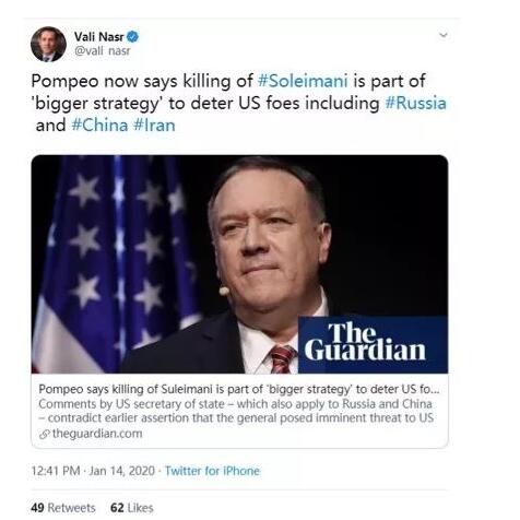 这些报道也很快在境外的社交网络上引起了一些关注。有西方的国际关系学者在转发相关报道时,也突出了“蓬佩奥说杀死苏莱曼尼是更大威慑战略的一部分,中国和俄罗斯也适用”的这一信息。
