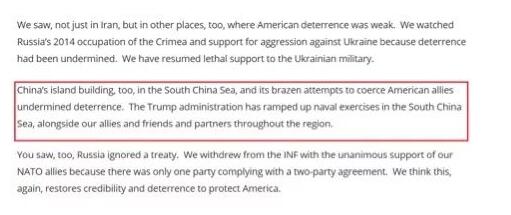 接下来,蓬佩奥才谈到了俄罗斯和中国。他说以往美国的“威慑”战略过于软弱,所以俄罗斯才会“吞并”克里米亚,中国才会在南海上修建岛屿。