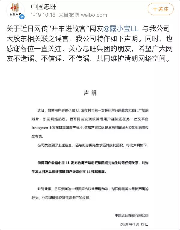 声明表示,经与忠旺集团大股东刘忠田先生求证并获得其授权,确认微博用户@露小宝LL 发布的房产与忠旺集团或刘先生均无任何关系。刘先生本人并不认识该微博用户@露小宝LL 或其家属。