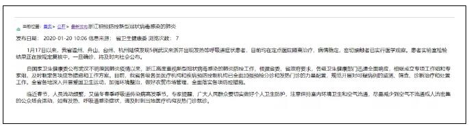 自国家卫生健康委公布武汉不明原因肺炎疫情以来,浙江高度重视新型冠状病毒感染的肺炎防控工作,根据省委、省政府要求,各级卫生健康部门迅速全面响应,相继成立专项工作组和专家组,及时制定各项应急措施和工作方案。目前,我省各级各类医疗机构和疾病预防控制机构已全面加强预检分诊和发热门诊的力量配置,规范开展对可疑病例的监测、筛查、诊断治疗和处置工作。全省各地深入开展爱国卫生运动,加强环境整治,做好农贸市场管理,全面落实各项防控措施。