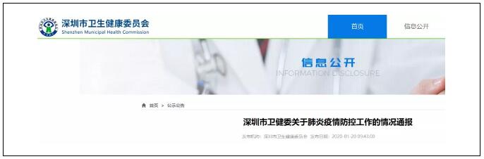 1月20日,深圳市卫生健康委员会网站发布《深圳市卫健委关于肺炎疫情防控工作的情况通报》。