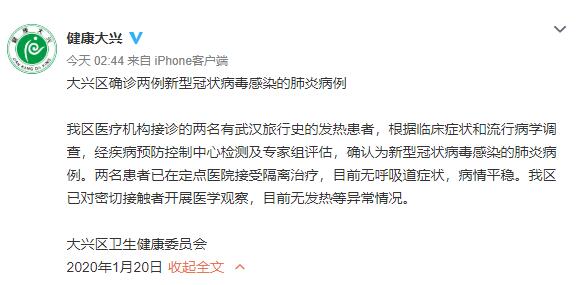 1月20日凌晨,北京大兴区卫生健康委员会官方微博通报,接诊的两名有武汉旅行史的发热患者,根据临床症状和流行病学调查,经疾病预防控制中心检测及专家组评估,确认为新型冠状病毒感染的肺炎病例。两名患者已在定点医院接受隔离治疗,目前无呼吸道症状,病情平稳。