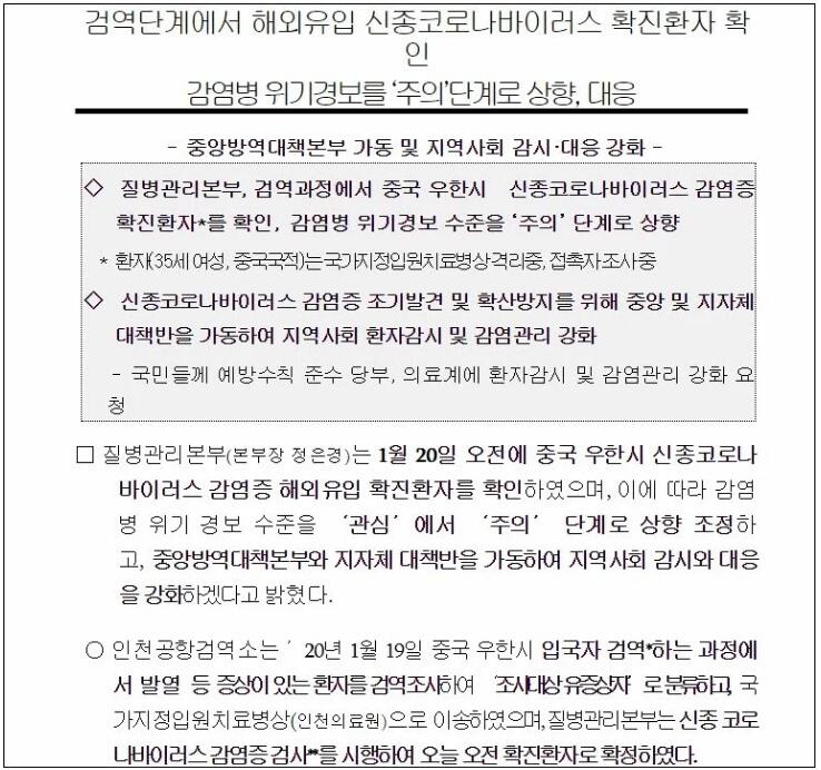 1月20日,韩国疾病管理本部称,1月19日从武汉出发经仁川机场入境韩国的一名35岁中国籍女性被确诊为新型冠状病毒肺炎患者。