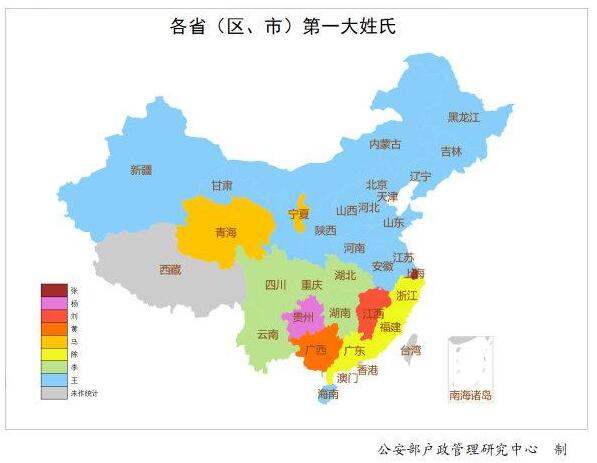 全国31个省(区、市)的姓氏人口分布不尽相同。“王”姓是全国第一大姓氏,同时也是北京、天津、河北、山西、内蒙古、辽宁、吉林、黑龙江、江苏、安徽、山东、河南、海南、陕西、甘肃、新疆16个省(区、市)第一大姓。“李”姓为湖北、湖南、重庆、四川、云南第一大姓。“张”姓为上海第一大姓。“刘”姓为江西第一大姓。“陈”姓为浙江、福建、广东第一大姓。“杨”姓为贵州第一大姓。“黄”姓为广西第一大姓。“马”姓为青海、宁夏第一大姓。