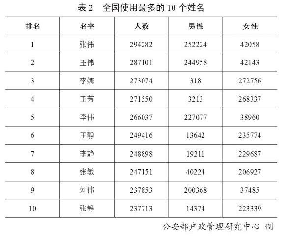 全国户籍人口中,使用频率最高的10个姓名依次为:“张伟”“王伟”“李娜”“王芳”“李伟”“王静”“李静”“张敏”“刘伟”“张静”。这些姓名男女皆有使用。(表2)