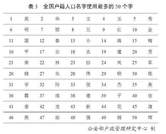 全国户籍人口中,名字使用频率最高的50个字依次为“英”“华”“文”“玉”“秀”“明”“丽”“兰”“红”“金”等。(表3)