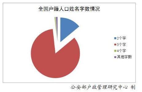 目前,我国除部分少数民族外,户籍人口姓名长度多为2至4个字。二字姓名为单姓单名、三字姓名为单姓双名或复姓单名、四字姓名为复姓双名,超过4个字的姓名比较少见。全国户籍人口中,三字姓名占比84.3%,二字姓名占比14.0%,四字姓名占比0.7%,其他字数姓名占比1.0%。
