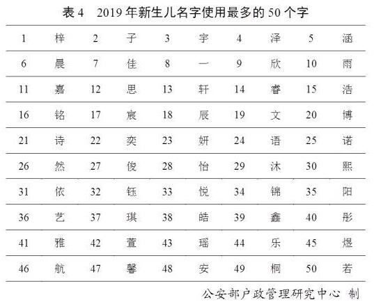 2019年出生并已经进行户籍登记的新生儿名字中,使用频率最高的50个字依次为“梓”“子”“宇”“泽”“涵”“晨”“佳” “一”“欣”“雨”等。与2018年相比,“锦”“瑶”“煜”“安”等字新晋成为新生儿起名用字首选。(表4)