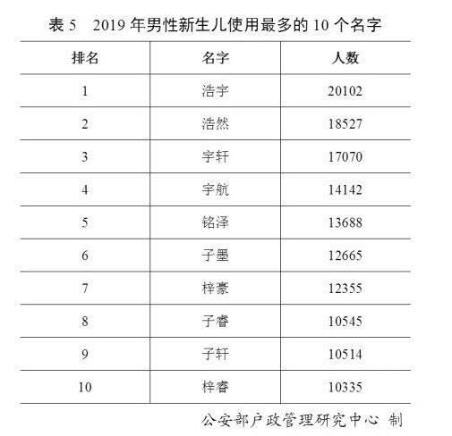 2019年出生并已经进行户籍登记的男性新生儿中,使用频率最高的10个名字依次为:“浩宇”“浩然”“宇轩”“宇航”“铭泽”“子墨”“梓豪”“子睿”“子轩”“梓睿”。与2018年相比,“铭泽”“子墨”“子睿”“梓睿”进入前十。(表5)