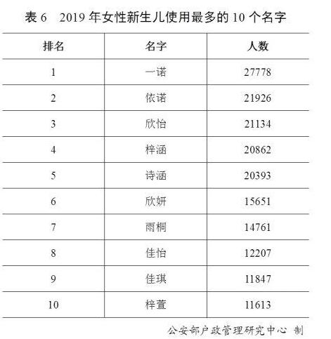 2019年出生并已经进行户籍登记的女性新生儿中,使用频率最高的10个名字依次为:“一诺”“依诺”“欣怡”“梓涵”“诗涵”“欣妍”“雨桐”“佳怡”“佳琪”“梓萱”。与2018年相比,“佳琪”进入前十。(表6)