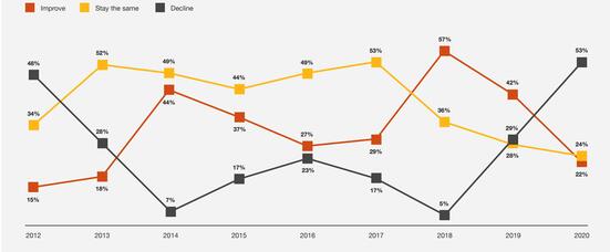 该调查注意到这种悲观情绪在全球各个地区广泛蔓延,而不是集中于局部地区的个别现象。在北美,这种悲观情绪甚至更加明显,有63%的北美CEO认为经济增速将在2020年进一步放缓。