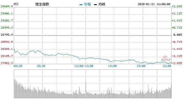 【香港商报网讯】 1月20日消息,新型冠状病毒疫情牵动着人心,也牵动着股市。今日A股、港股集体走低,港股28000点岌岌可危!今日早盘,恒指低开低走,午后跌幅扩大至2.6%。截至收盘,恒指跌2.81%,创2019年5月6日以来最大跌幅。恒指收盘报27985.33失守28000点,日内大跌约810.58点。恒生国企指数跌3.19%,红筹指数跌3.03%。