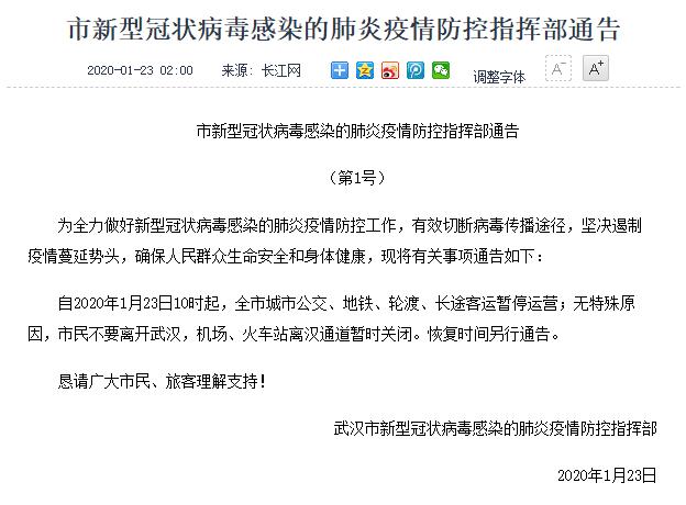 这是2020年1月23日凌晨。武汉市疫情防控指挥部发出了第一号通知。今日上午10时,全市公交、地铁、轮渡、长途客运暂停营运,机场、火车站离汉通道暂时关闭。