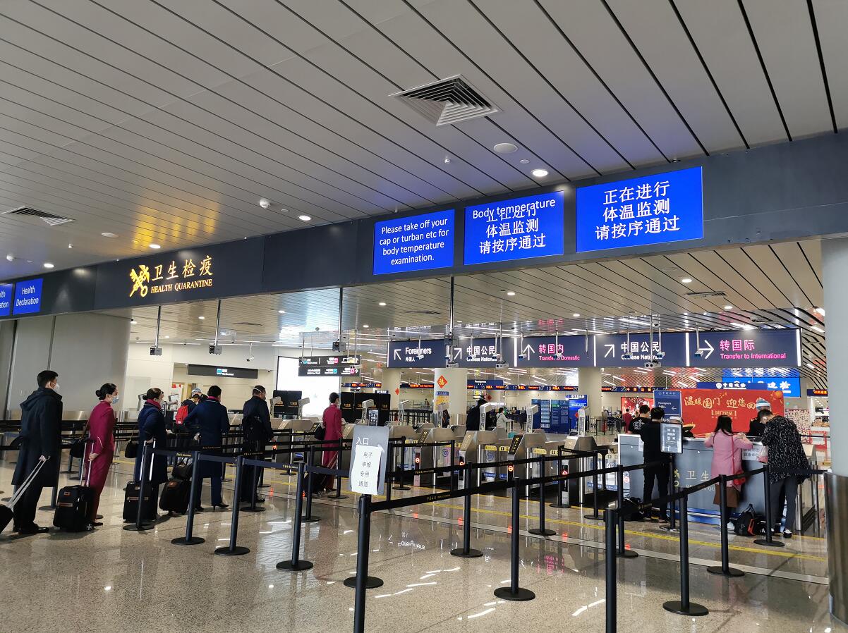 “已通过微信小程序进行健康申报的旅客,请出示申报记录条形码,依次通过测温通道。”旅检二处卫生检疫科科长李伟东一边拿着扫码枪扫描通过线上申报旅客的条形码,一边接过现场旅客递过来的《健康申明卡》,指引旅客配合做好体温检测。“所有出入境旅客必须接受体温检测,如果测温通道报警,则必须进行流行病学调查和医学排查”。