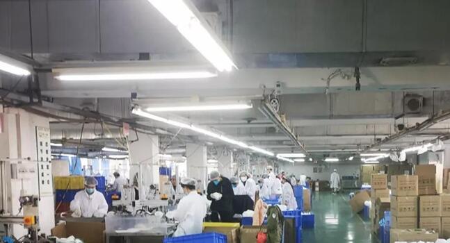 现场车间人员不息,机器不停,每天连续16个小时加班加点生产新型冠状病毒感染肺炎疫情防控急需的口罩。