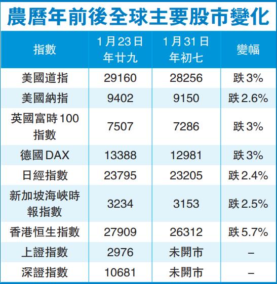 对比环球主要股市,由年廿九(1月23日)至年初七(1月31日)期间,恒指跌5.7%,大幅跑输新加坡海峡时报指数的跌2.5%,及日经指数的跌2.4%。至于美国道指、纳指、英国富时100指数、德国DAX指数于同一时期的跌幅,则介乎2.6%至3%。