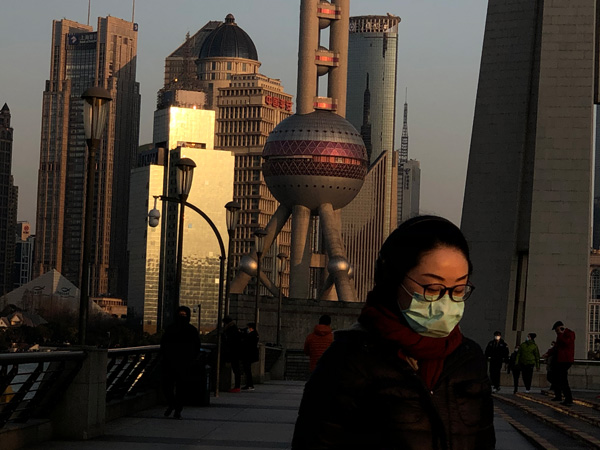 2月1日,上海街头,一位戴口罩的妇女,留意到老人手里的鸟。