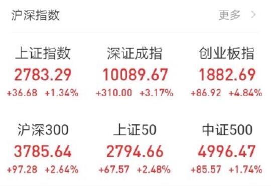 【香港商报网讯】两市今日低开高走,三大股指悉数翻红并持续走高,题材股和权重股携手走强。截至收盘,沪指涨1.34%,深证成指涨3.17%,创业板指涨4.84%。